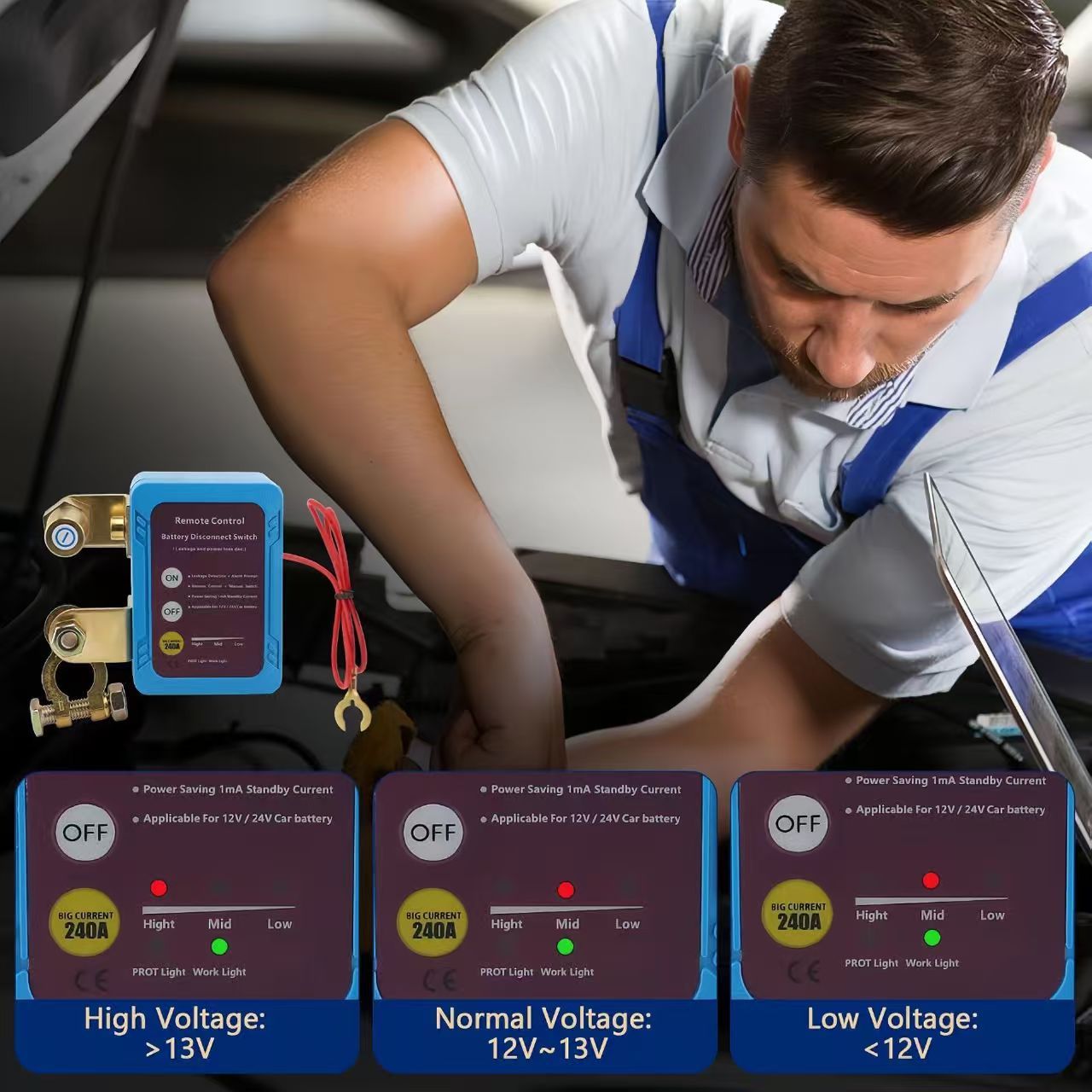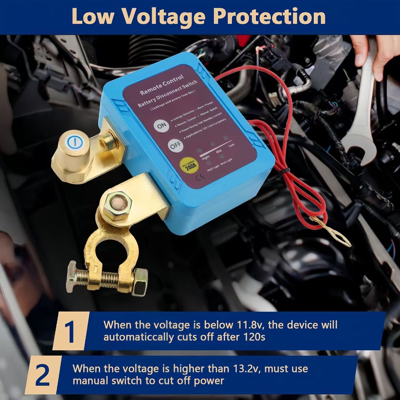 5.If the voltage is higher than 13.3 V (12V system)/26.2 V (24V system) , the RF remote control will fail to prevent the remote control button from accidentally touching the remote control during driving, which will lead to power failure.