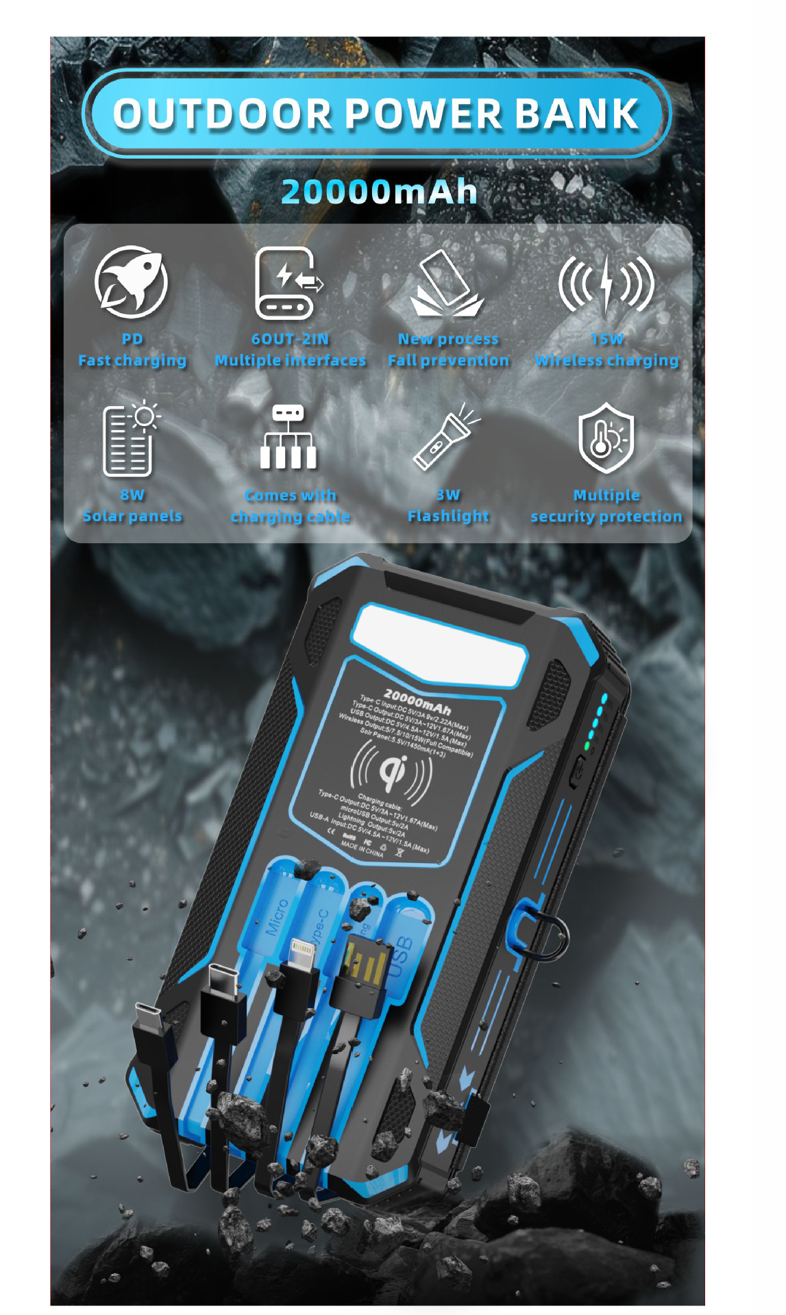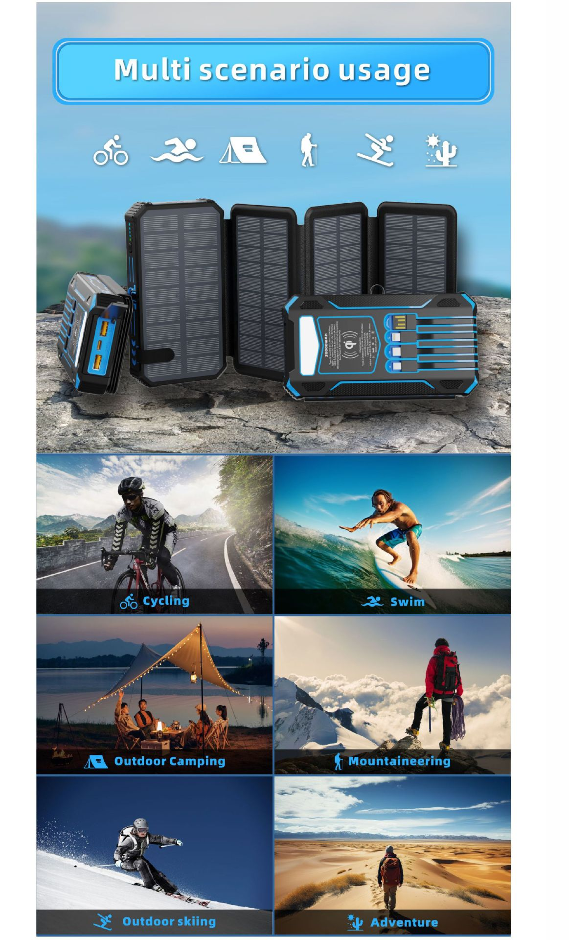 🔥 High-Capacity Solar Charger Power Bank, 4 Built-in Cables 20000mAh